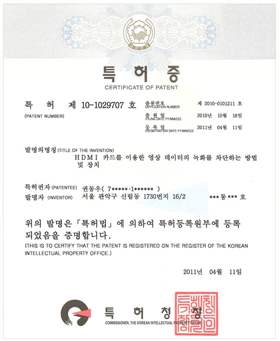특허 등록 : HDMI 캡쳐카드를 통한 캡쳐차단기술