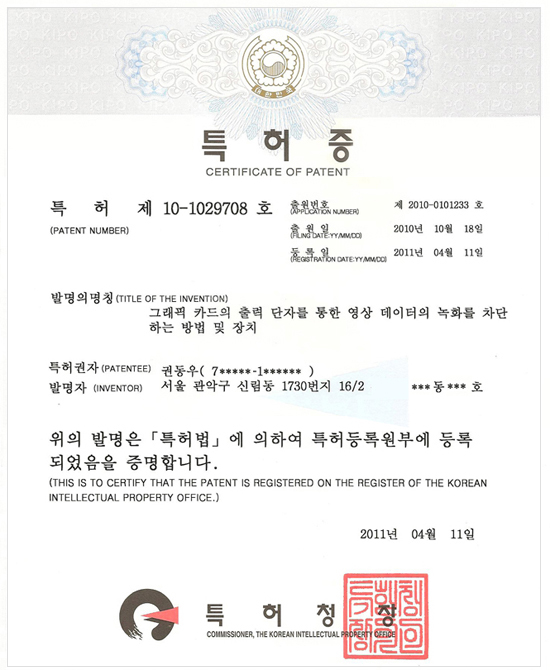 특허 등록 : 비디오카드틀 통한 캡쳐차단 기술